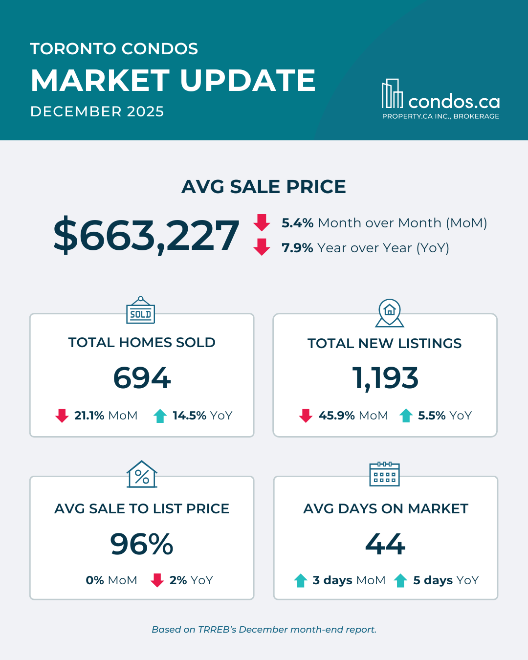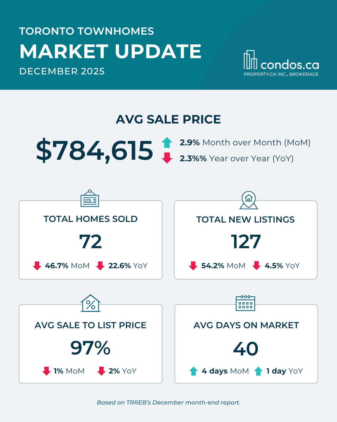 Detached homes continued to hold up better than the rest of the market, especially in the 905 as usual, where end-user demand remains more stable. Townhomes showed mixed results depending on location and price point, with well-positioned listings still moving, but without urgency. Condos remained the softest segment. Condo sales were down roughly 20 percent year over year, and pricing pressure was still most visible in downtown investor-heavy stock, where days on market continue to stretch and buyers remain highly selective.